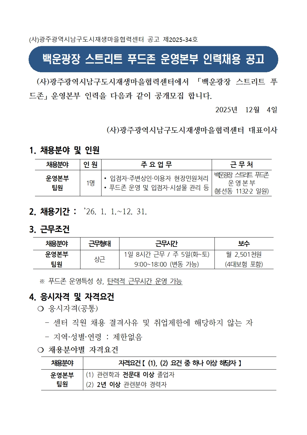 - 근 무 처 : 백운광장 스트리트 푸드존 운영본부(남구 봉선동 1132-2번지 일원)