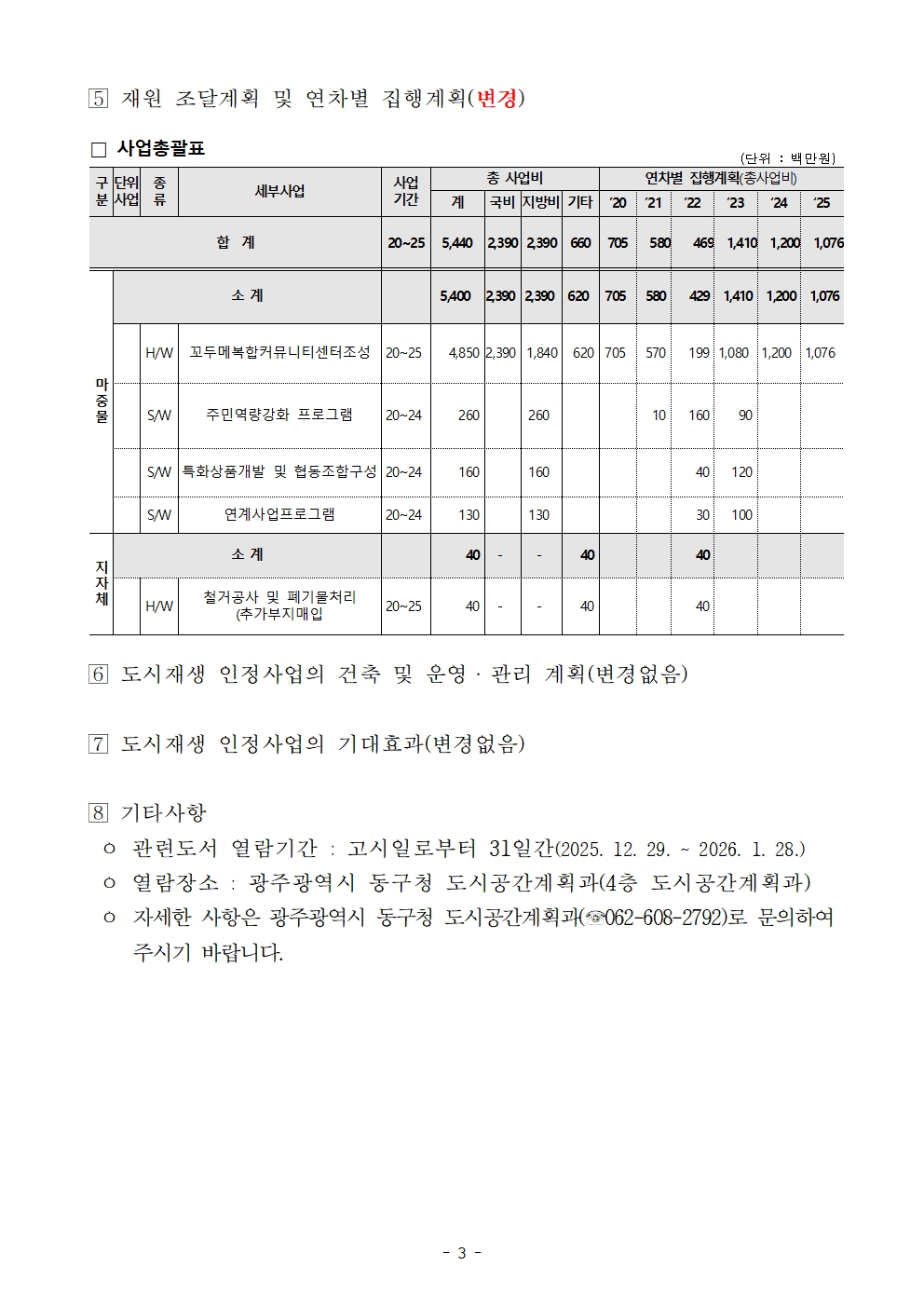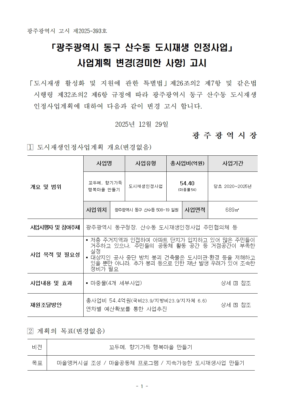 「광주광역시 동구 산수동 도시재생 인정사업」사업계획 변경(경미한 사항) 고시